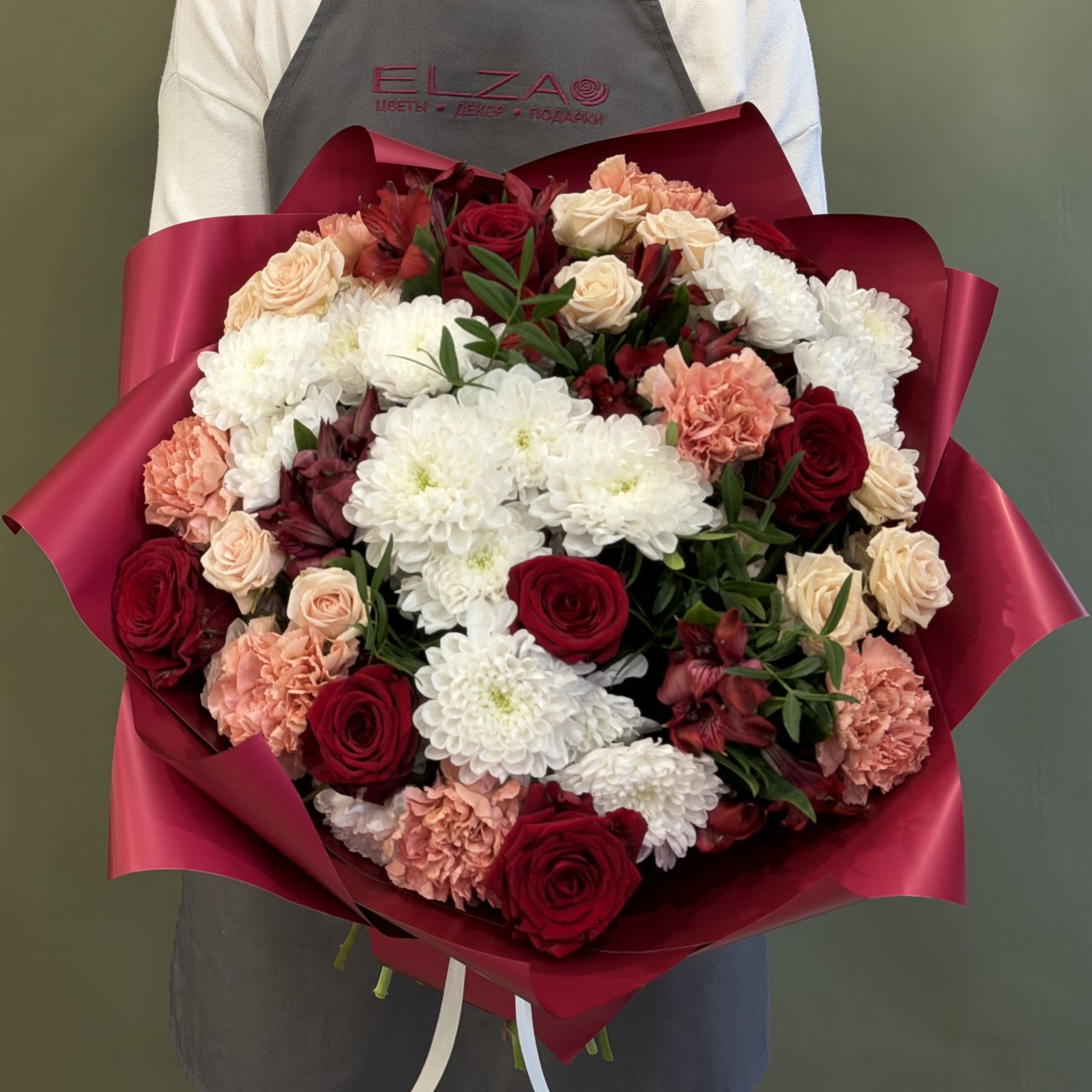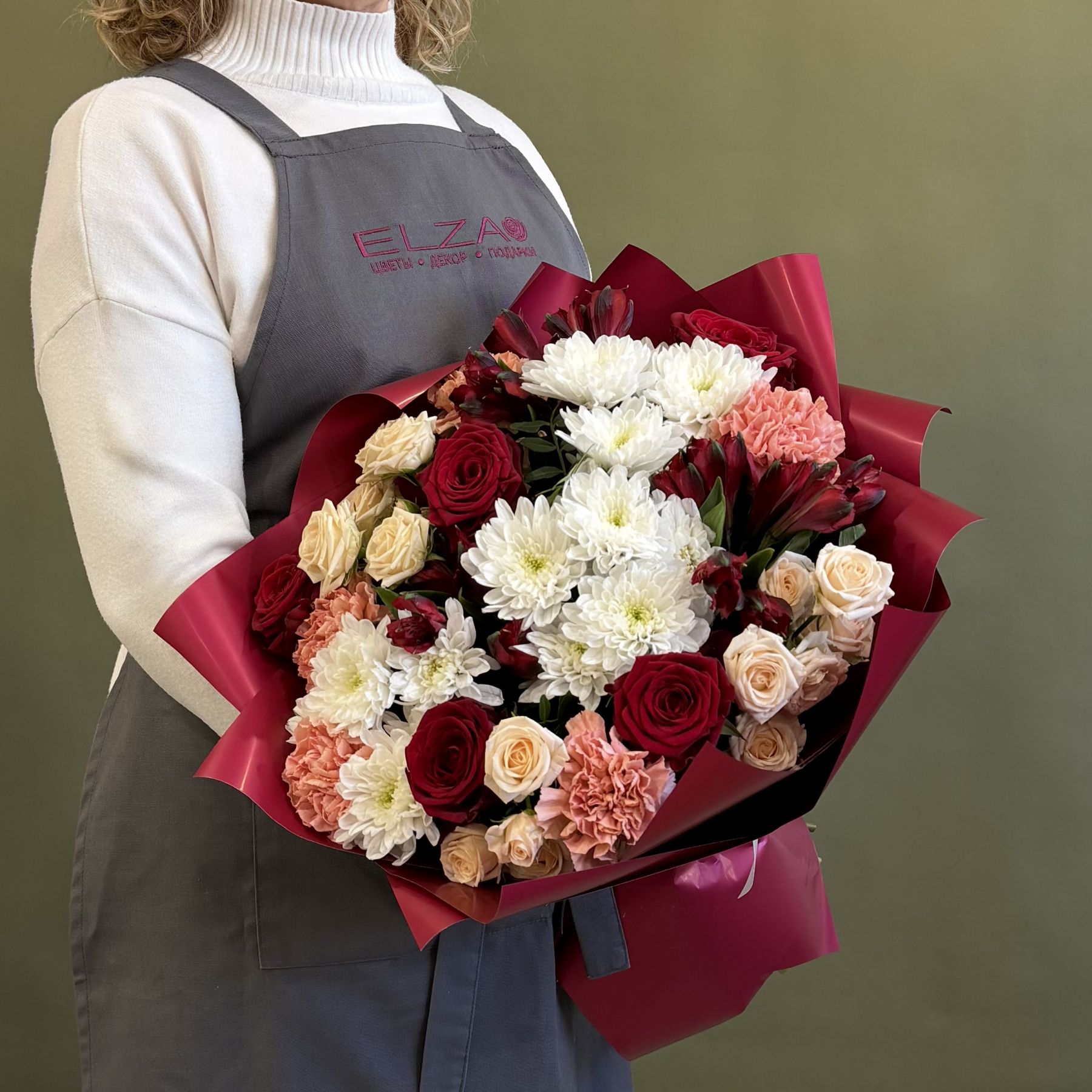 Красивый букет из роз, хризантем, альстромерий и диантусов "Мечта".