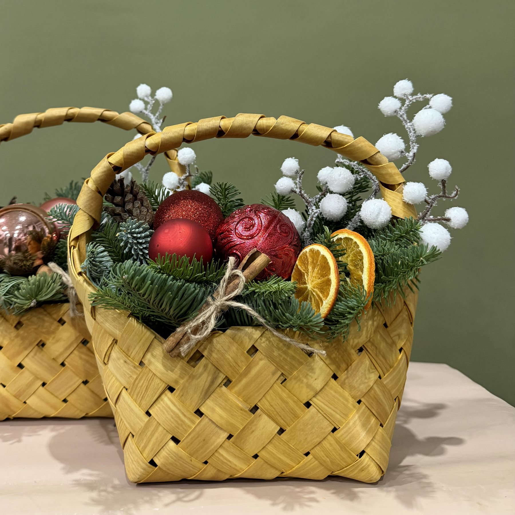 Милые корзинки из ели нобилис в разных цветовых решениях.