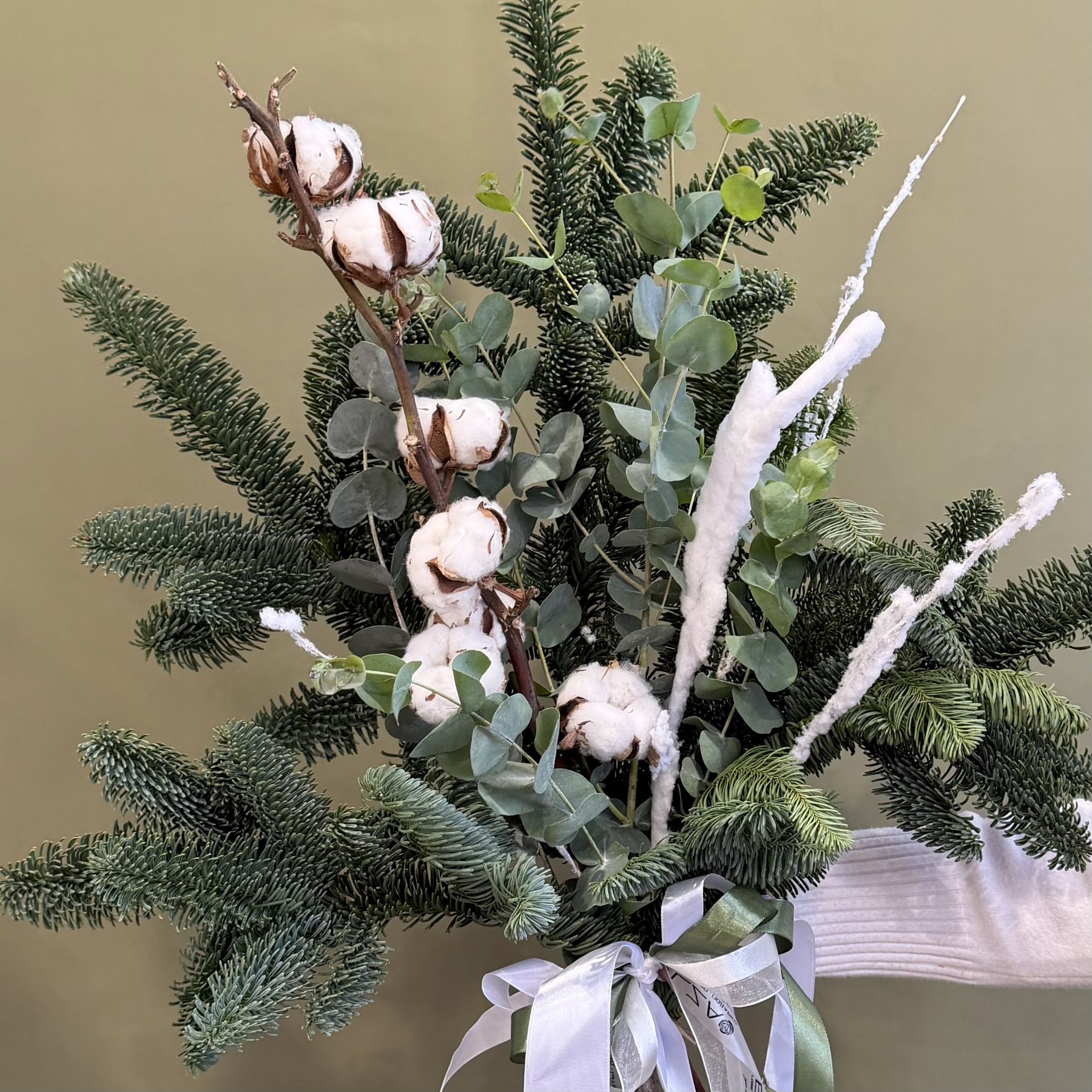 Зимний букет из нобилиса, эвкалипта и хлопка с заснеженными ветками