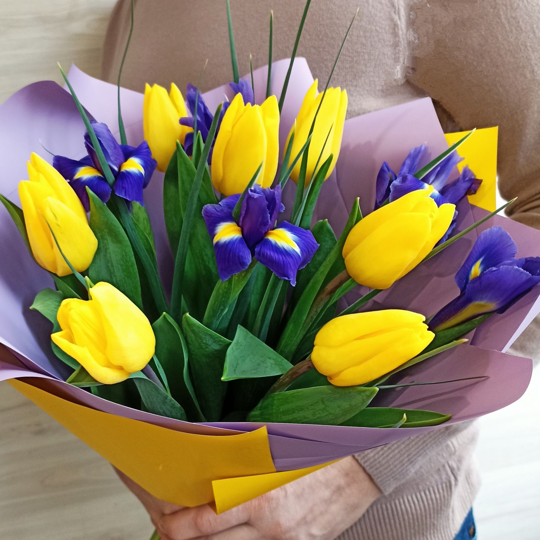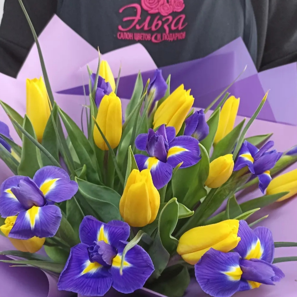 Яркий весенний букет тюльпаны с ирисами: